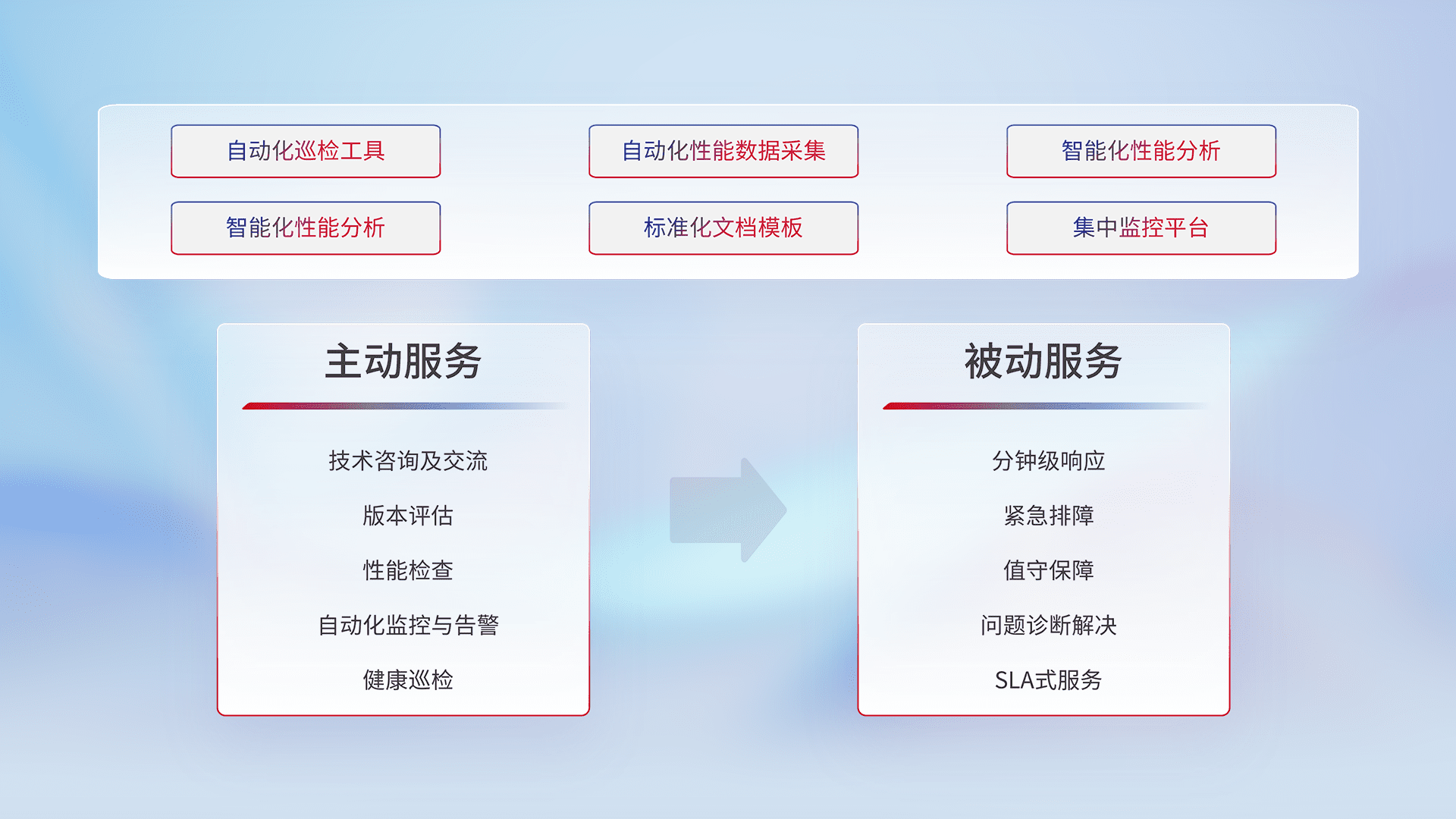 智能化工具和标准化文档,,保障服务质量,,提供主动服务(包含技术咨询、、、版本评估、、性能检查、、、自动化监控与告警、、、、健康巡检)和被动服务包含(分钟级响应、、、紧急排障、、、、值守保障、、、问题诊断解决、、SLA服务)。。。。